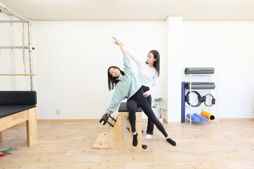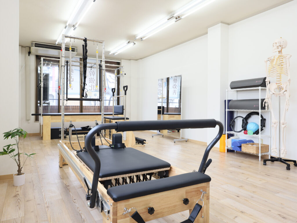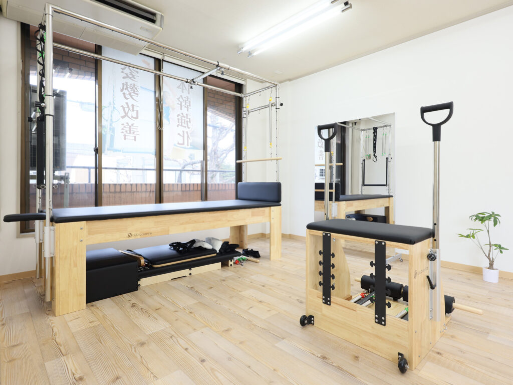 当店はリフォーマー、チェア、キャデラックなど、様々なピラティスマシンを取り揃えています。マシンを使うことで“体のクセ”を補正し、無理なく正しいフォームへ誘導していきます。